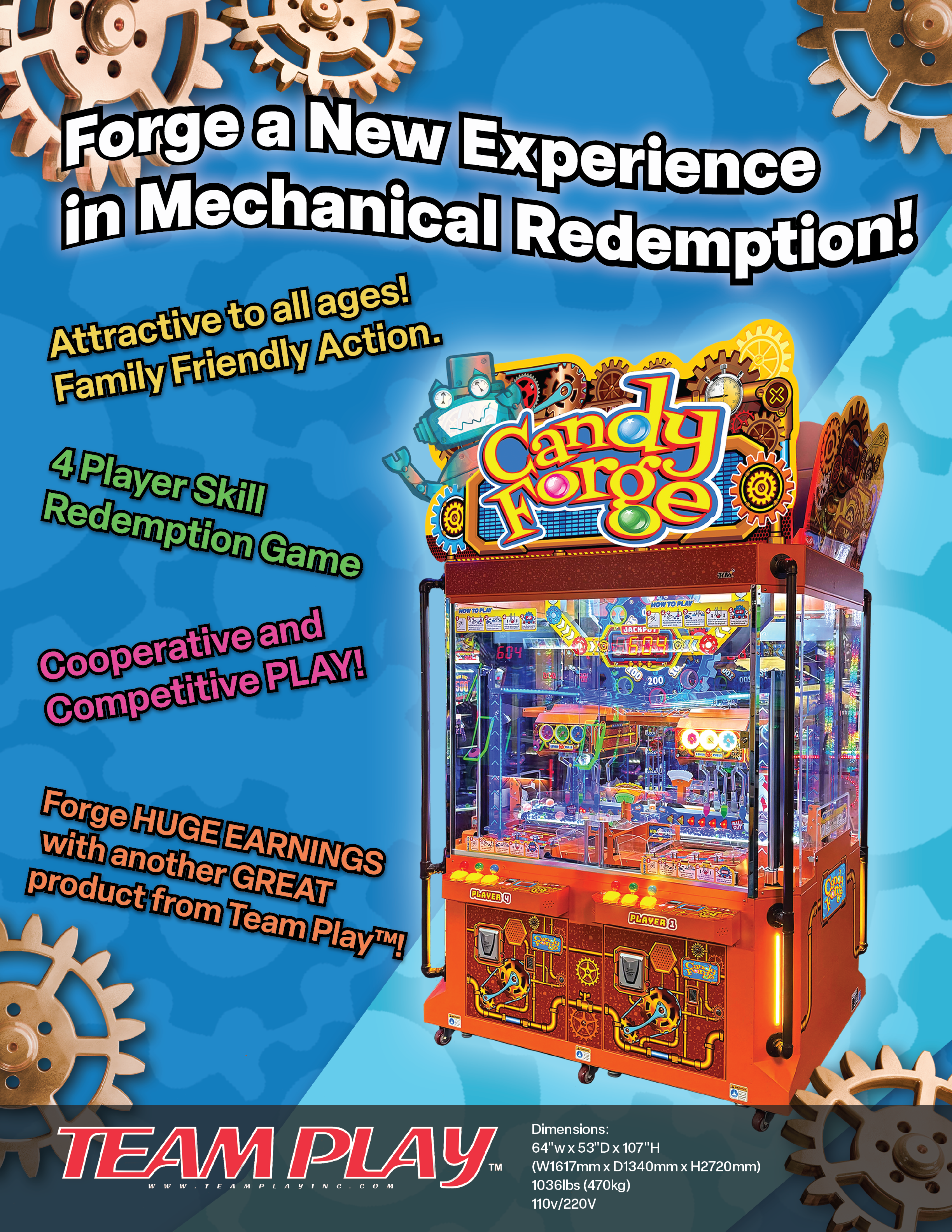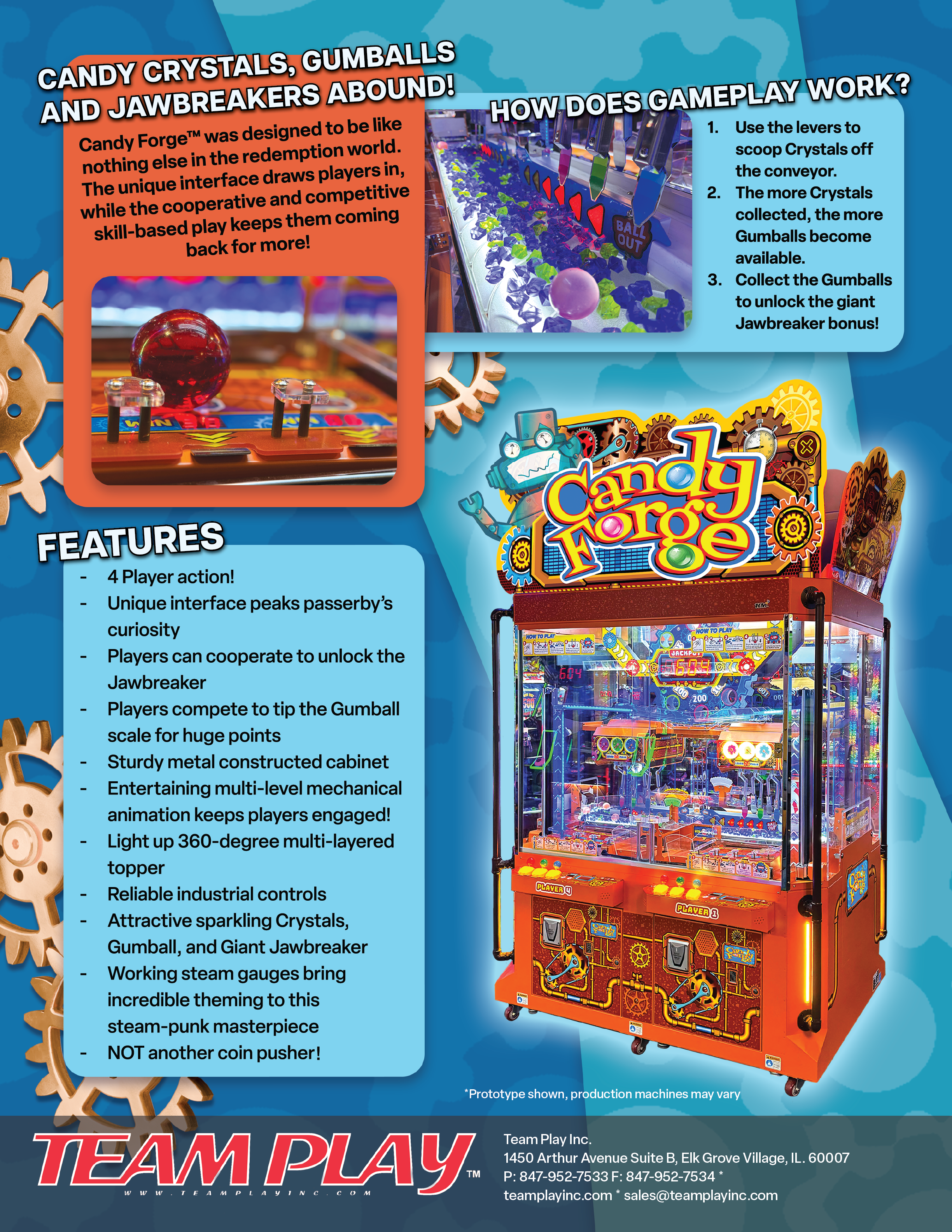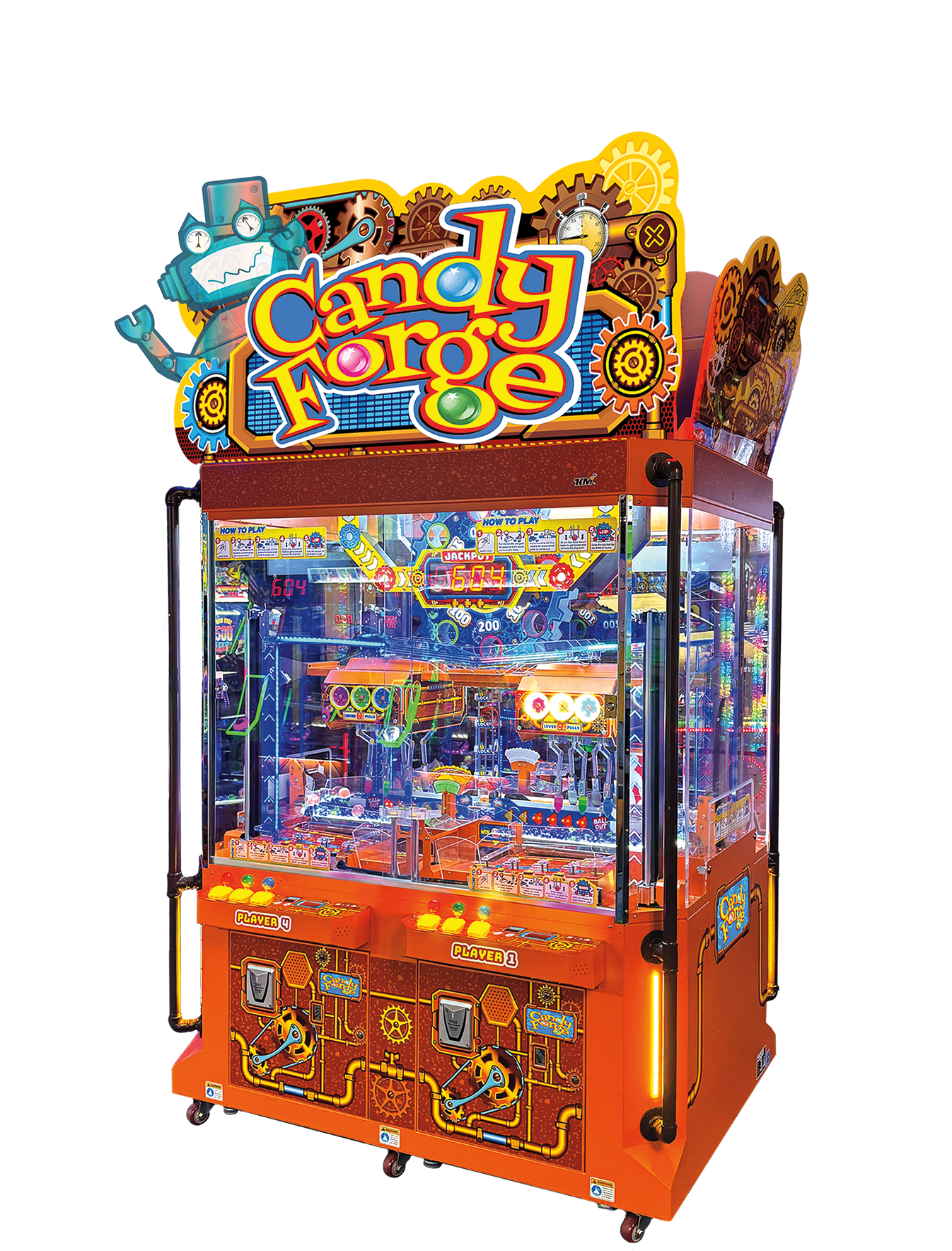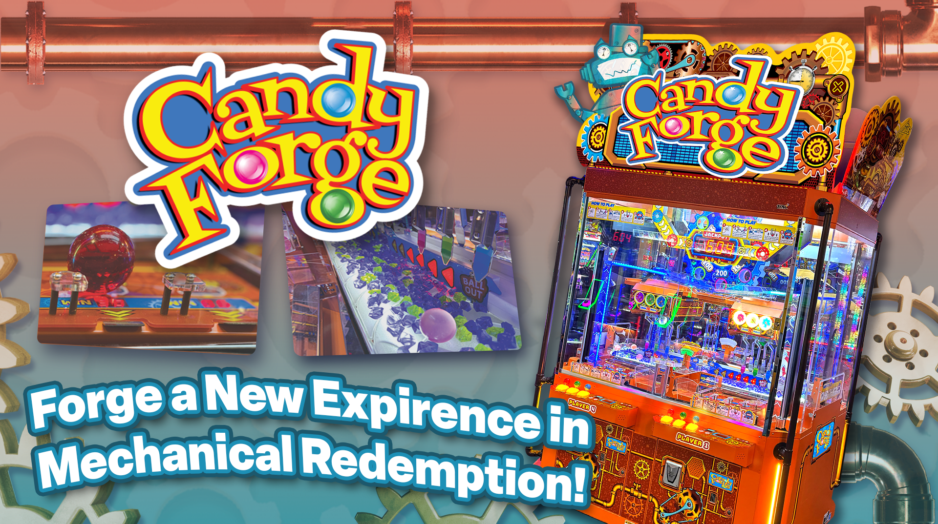 Candy Forge was designed to be like nothing else in the redemption world. The unique interface draws players in, while the cooperative and competitive skill-based play keeps them coming back for more! The gameplay is easy, use the levels to scoop crystals off of the conveyer. The more crystals collected, the more Gumballs become available. Collect the Gumballs to unlock the giant Jawbreaker Bonus!