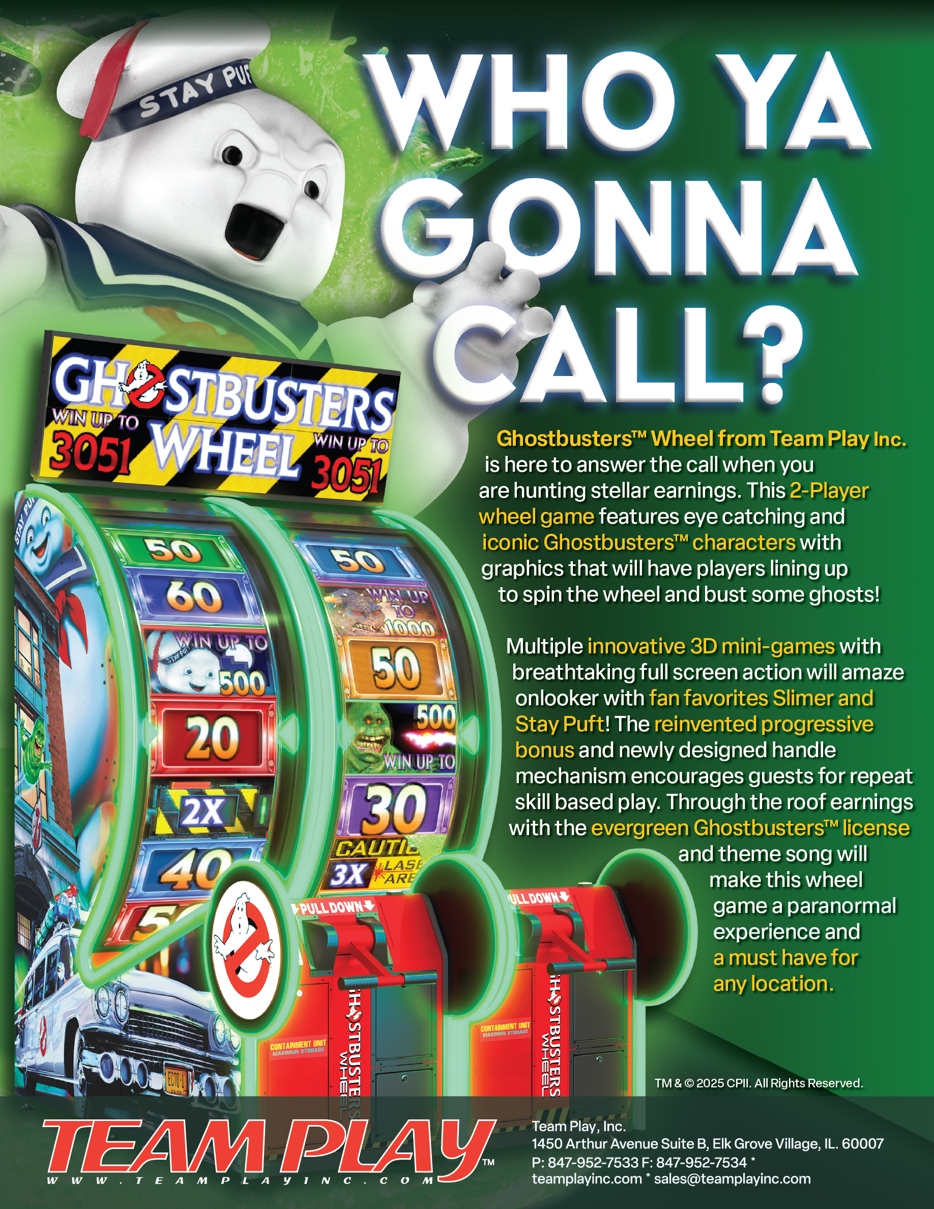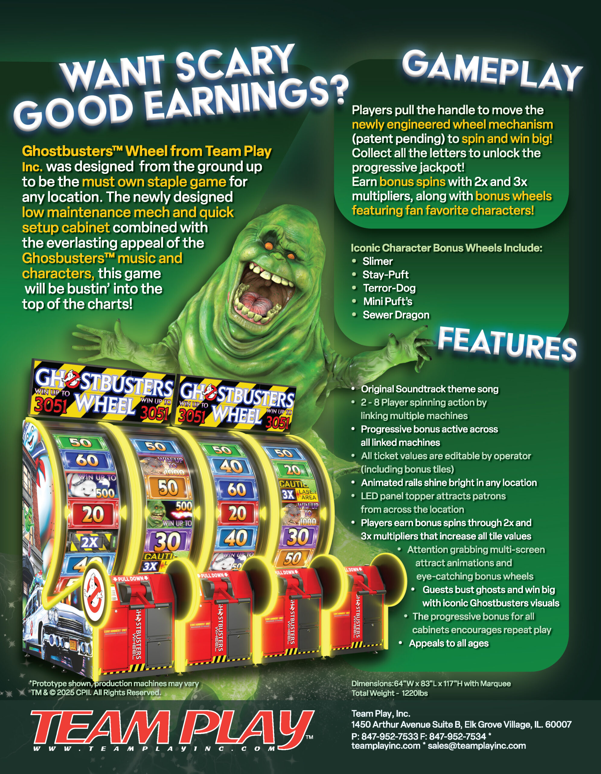 Ghostbusters Wheel™ from Team Play Inc. is here to answer the call when you are hunting stellar earnings. This 2-player wheel game features eye-catching and iconic Ghostbusters™ characters with graphics that will have players lining up to spin the wheel and bust some ghosts.